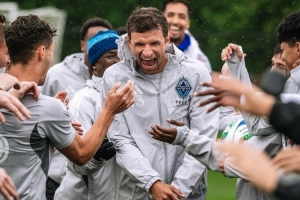 穆勒首次参加温哥华白浪训练,队友们组成“欢迎通道”,让他从中间穿过,并不断拍打这位德国足坛传奇表示欢迎。
