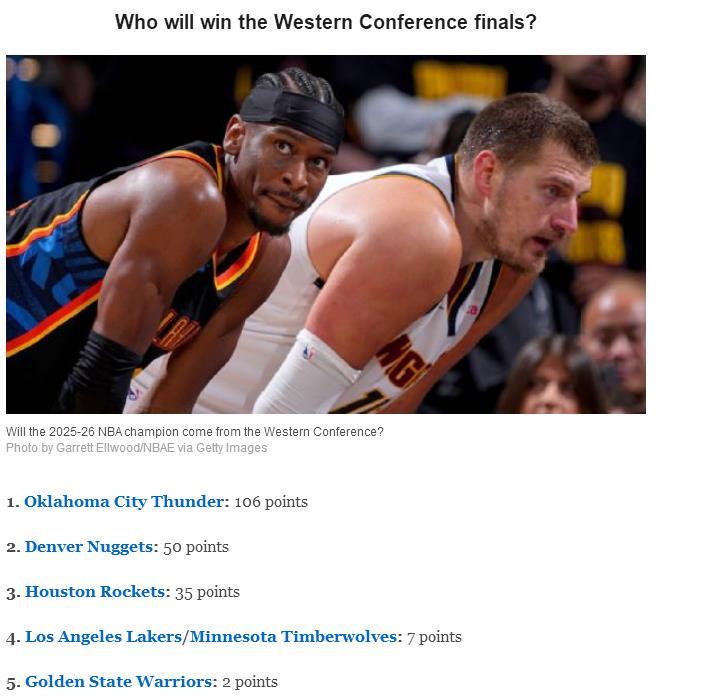 点评:休赛期保留全部争冠核心——卫冕得分王、MVP和总决赛MVP谢伊-吉尔杰斯-亚历山大正处于巅峰初期,而且他的明星搭档杰伦-威廉姆斯和切特-霍姆格伦也都是冉冉上升的天才,他们休赛期全部留队。与其他球队相比,雷霆队不需要磨合期,这是他们与西部其他豪强之间的最大区别,虽然这个休赛期西部很热闹,纸面实力很强的球队不少,但最终的结果需要球员在场上磨合,谁也不能保证化学反应的结果如何,他们刚刚成为近五十年来最年轻的NBA总冠军球队,雷霆拥有卫冕冠军级别的阵容延续性,这就决定了下赛季的雷霆依旧是西部冠军的第一人选。ESPN预测的下赛季西部冠军中,雷霆队获得了106分,比第二至第六的五支球队总得分还要高。各位看官如何看待ESPN关于下赛季西部冠军的预测,请在评论区讨论!(注:本文数据在ESPN官网、直播吧都可查询