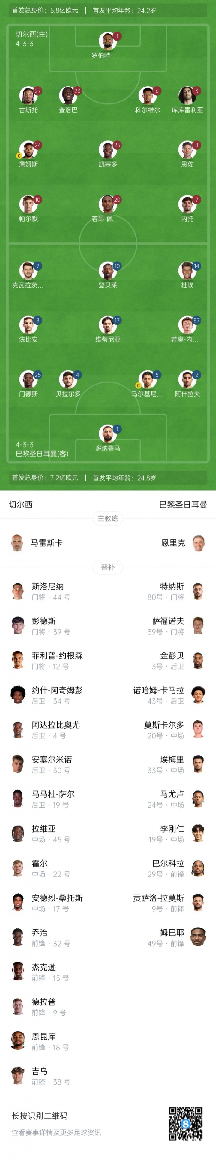 切尔西首发:1-罗伯特-桑切斯、27-古斯托、23-查洛巴、6-科尔维尔、3-库库雷利亚、24-里斯-詹姆斯、25-凯塞多、10-帕尔默、8-恩佐、7-内托、20-若昂-佩德罗