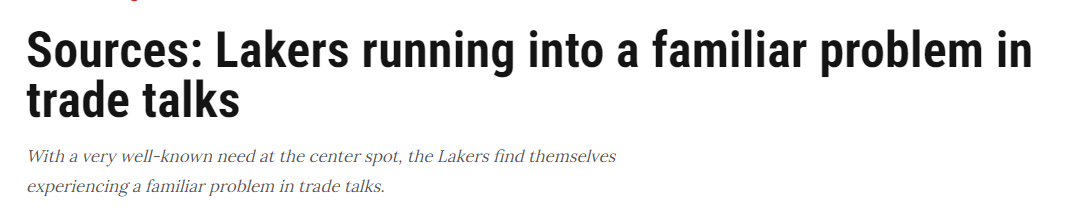 湖人在中锋市场上的挫败感令人抓狂的是,他们本应该从自己最近在交易市场上的经历中吸取教训,因为市场清楚地知道他们必须做什么。